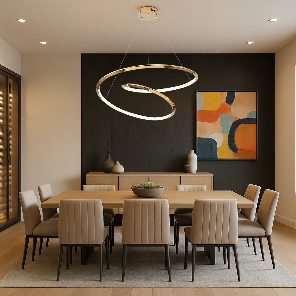 The Luxury Crystal Linked Loop Chandelier Pendant showcases fluid, interlocking loops finished in gold, each illuminated with warm integrated LED lighting. Suspended by ultra-thin cables, its sculptural form brings ambient glow and graceful movement to dining rooms, bedrooms, or modern open-concept spaces.