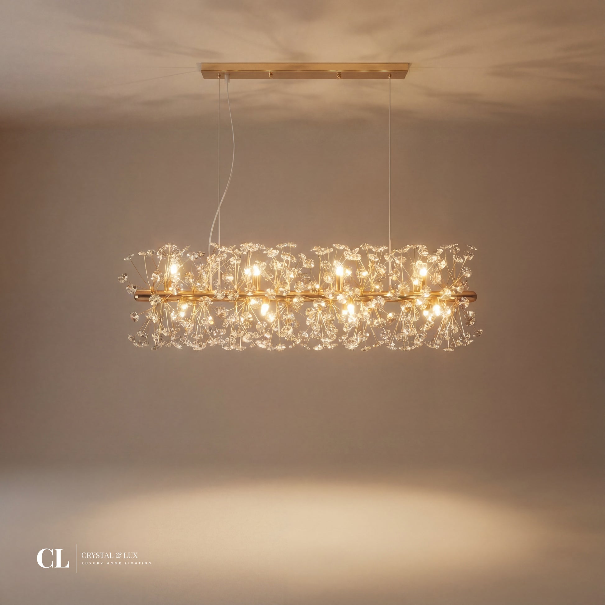 The Crystal Blossom Chandelier captures the beauty of nature in a sculptural, modern form, with delicate crystal petals blooming along a golden framework. Warm integrated LEDs illuminate each textured detail, casting a soft, shimmering glow that feels both organic and refined, perfect for dining areas, living rooms, or entryways that call for elegance with a touch of artistry.