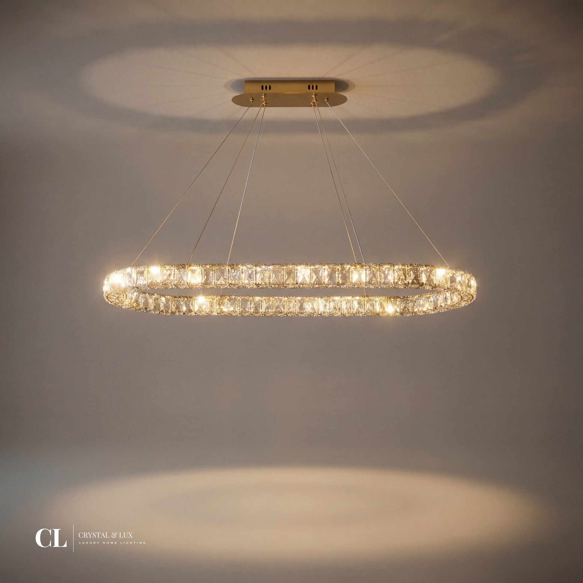 The Crystal Curved Frame Chandelier blends sculptural form with radiant elegance, featuring an elongated oval frame embedded with shimmering crystal accents and suspended by fine cables from a sleek gold canopy. Its warm LED glow and adjustable height make it a refined focal point for dining rooms, living areas, or entryways that call for timeless style and modern sophistication.