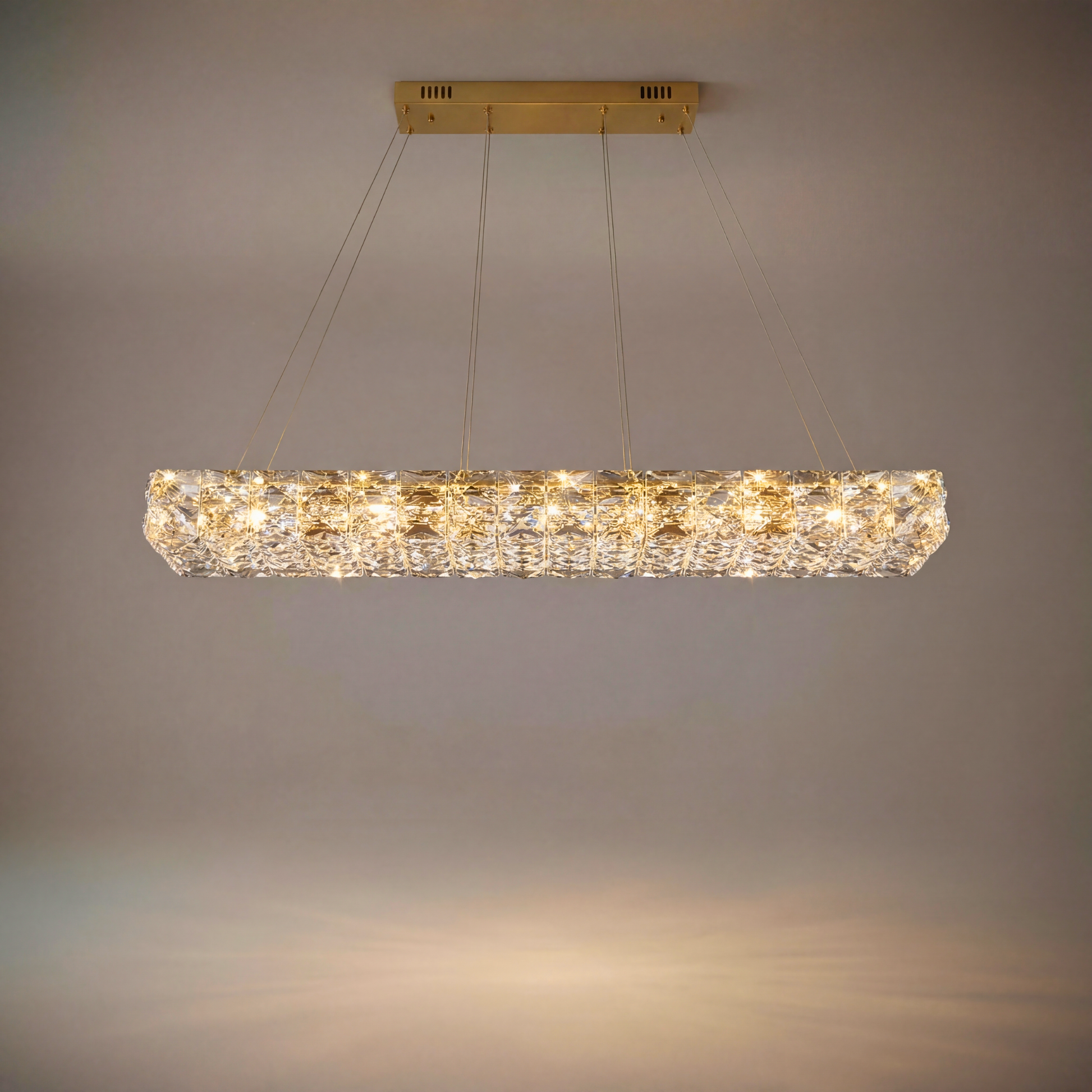 The Crystal Slab Pendant pairs sleek geometry with radiant elegance, featuring a horizontal slab of faceted crystal suspended by ultra-thin cables. Integrated warm LEDs shine through precision-cut crystal, casting a golden glow that elevates dining areas, living rooms, or open-concept spaces with modern minimalism and sculptural impact.