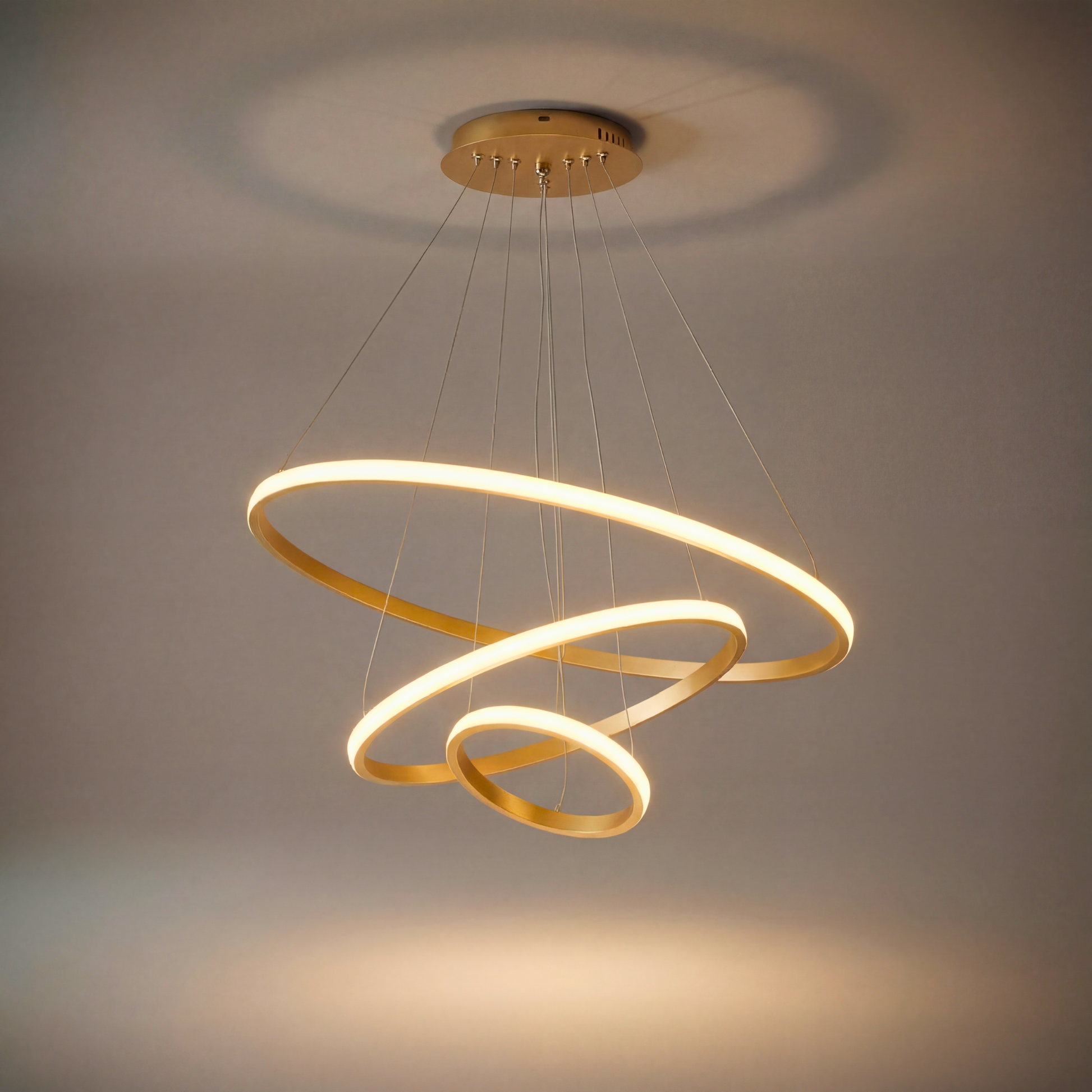 The 3-Ring Halo Chandelier features three gold-finished LED rings suspended in a spiraling formation, creating a striking yet balanced sculptural presence. Ideal for dining rooms, bedrooms, or living areas, it offers warm ambient lighting and a sleek modern profile that blends effortlessly into contemporary spaces.