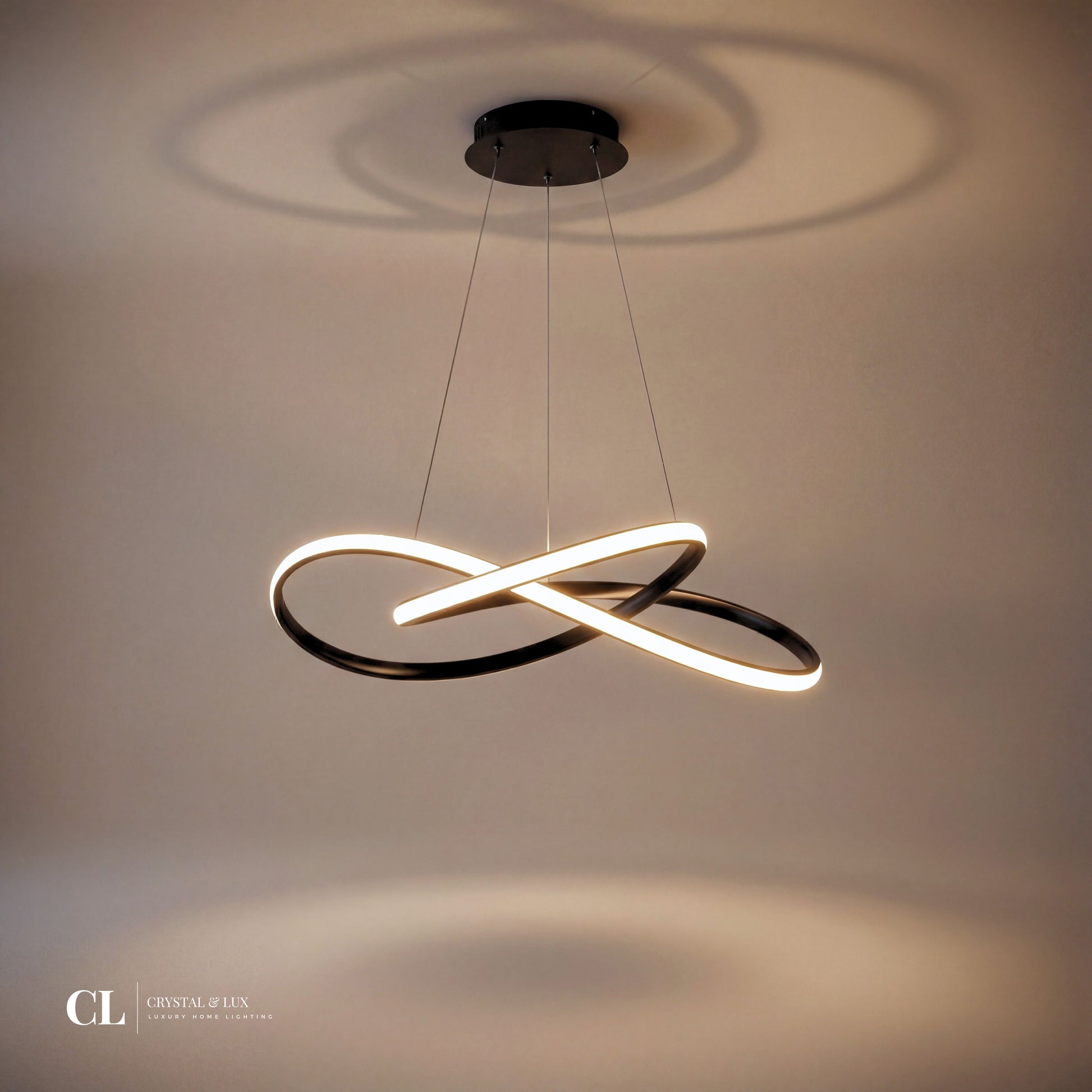 The Black Infinity Loop Pendant features a fluid, asymmetrical ring design that adds sculptural elegance to any room. Finished in matte black with integrated LED lighting, it offers a soft ambient glow that suits bedrooms, kitchens, or living spaces, delivering bold style with minimalist restraint.