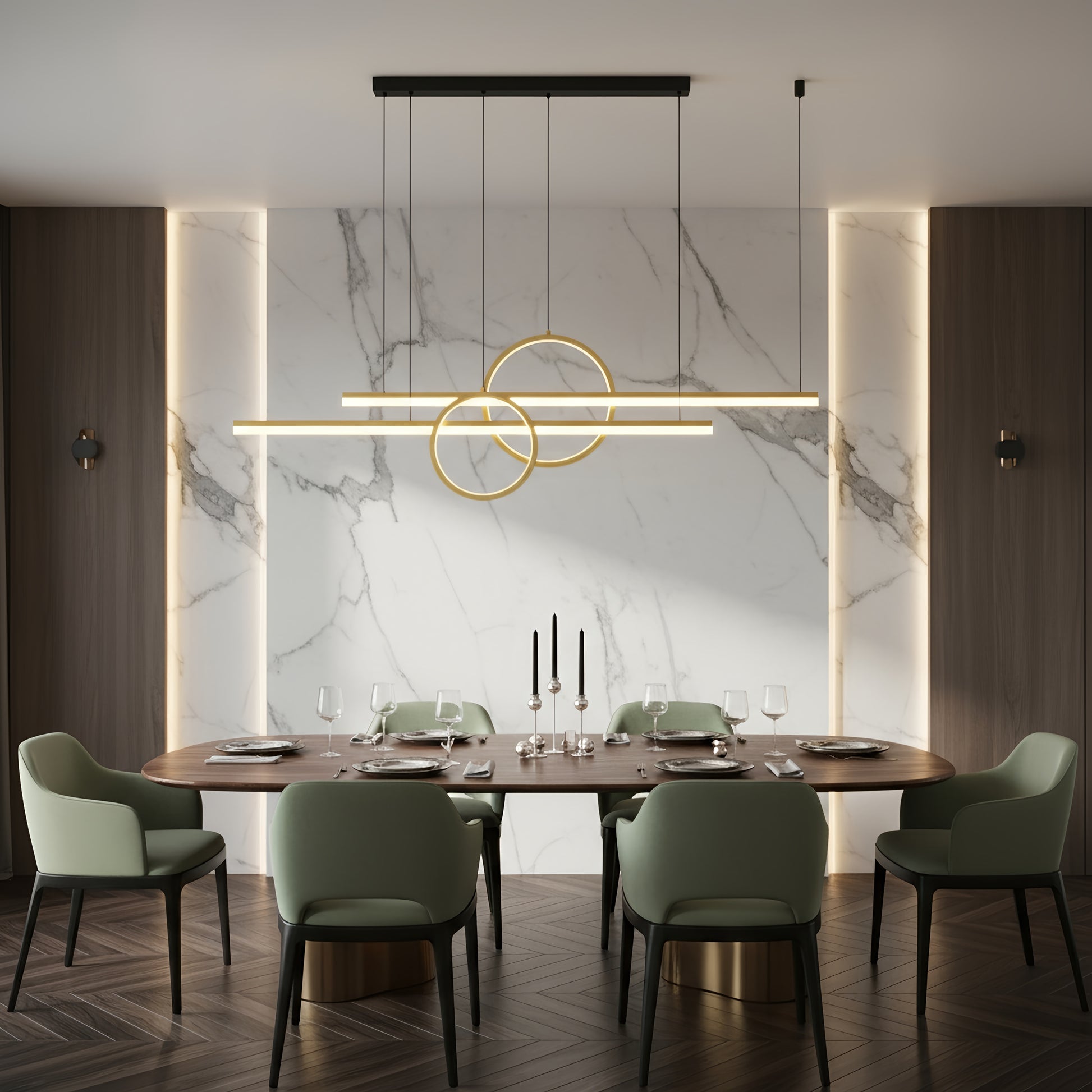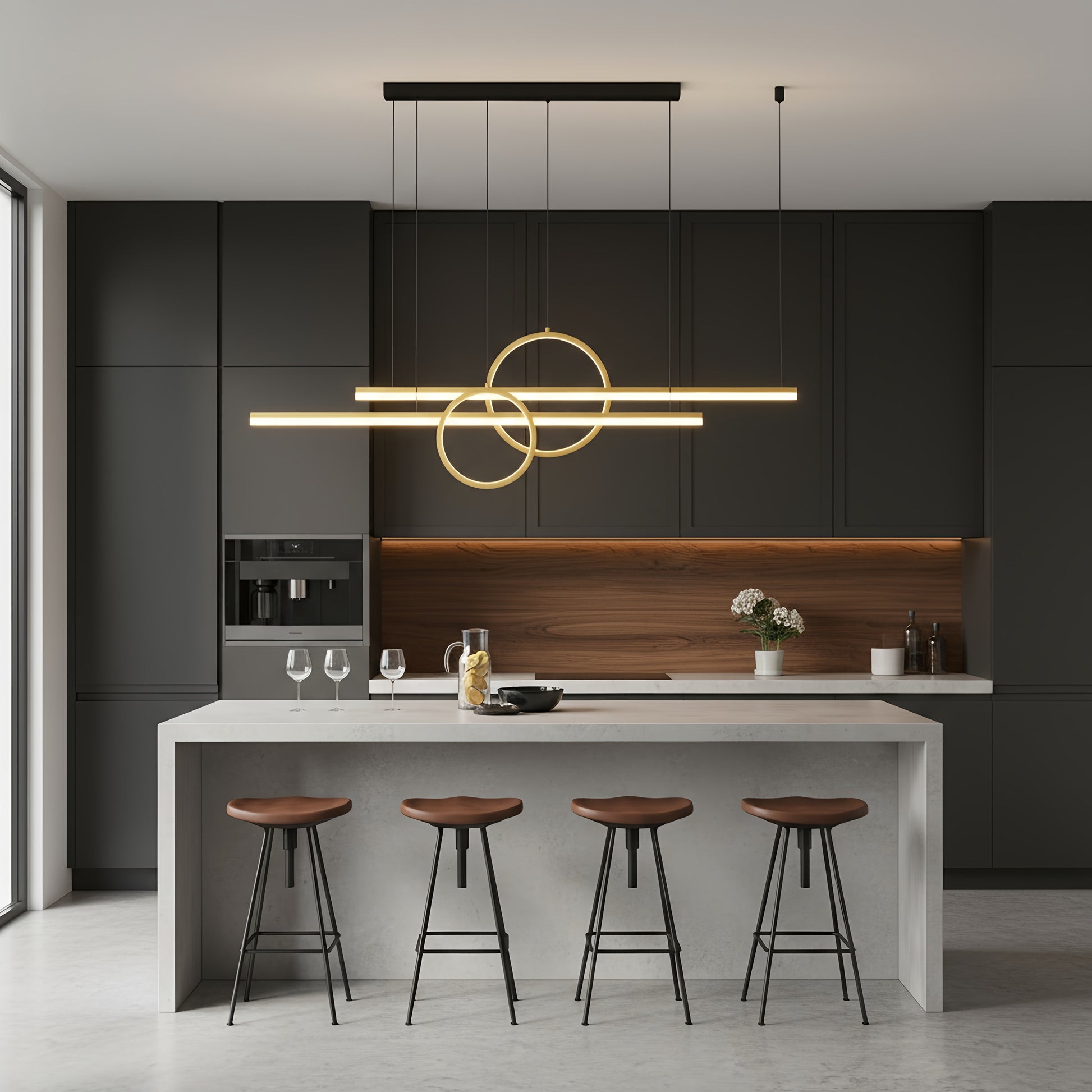 The Modern Linear Ring Layered Chandelier Pendant features a clean, sculptural structure of horizontal bars intersected by two circular halos, creating a bold geometric focal point. Integrated LED lighting outlines the frame with a soft, ambient glow, bringing a sleek, futuristic edge to dining areas, kitchens, and open-concept spaces.