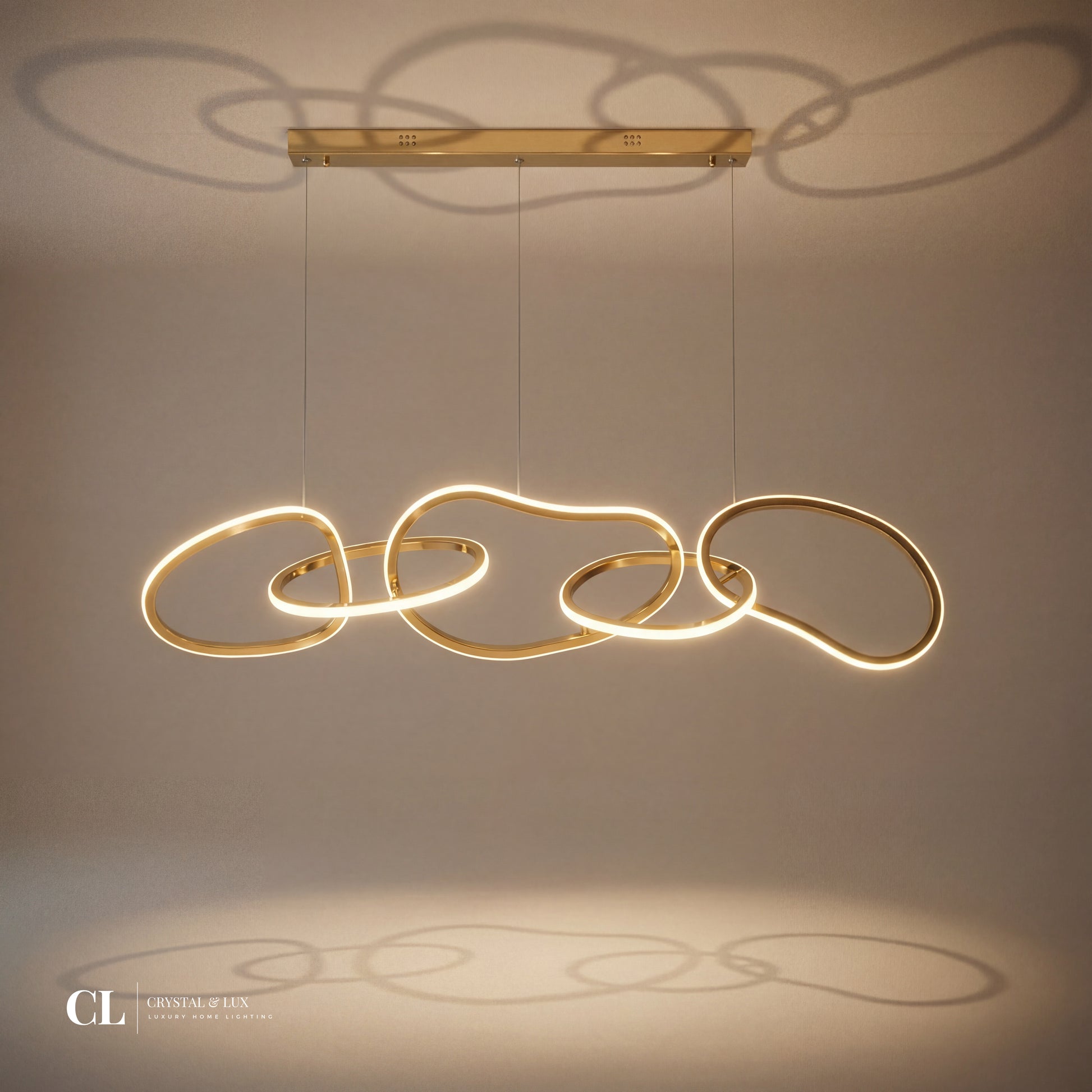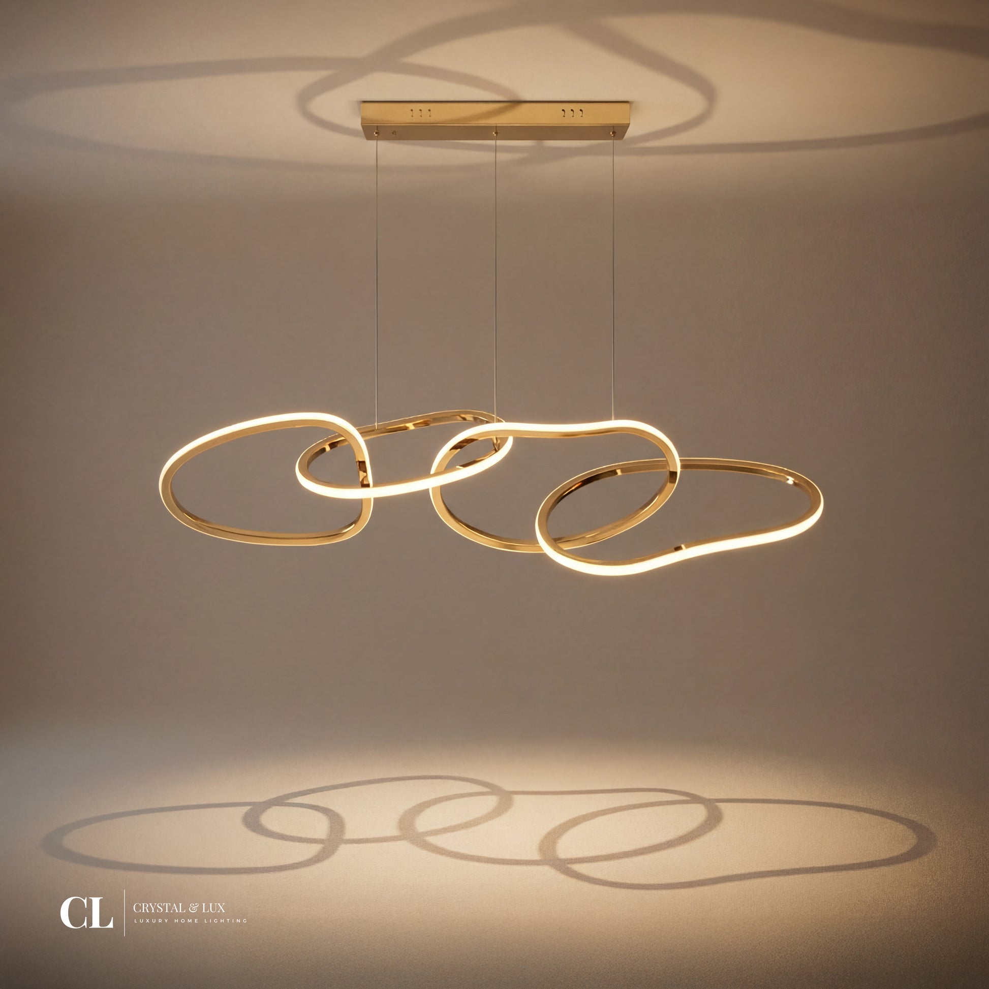 The Linked Loop Chandelier showcases fluid, interlocking loops finished in gold, each illuminated with warm integrated LED lighting. Suspended by ultra-thin cables, its sculptural form brings ambient glow and graceful movement to dining rooms, bedrooms, or modern open-concept spaces.