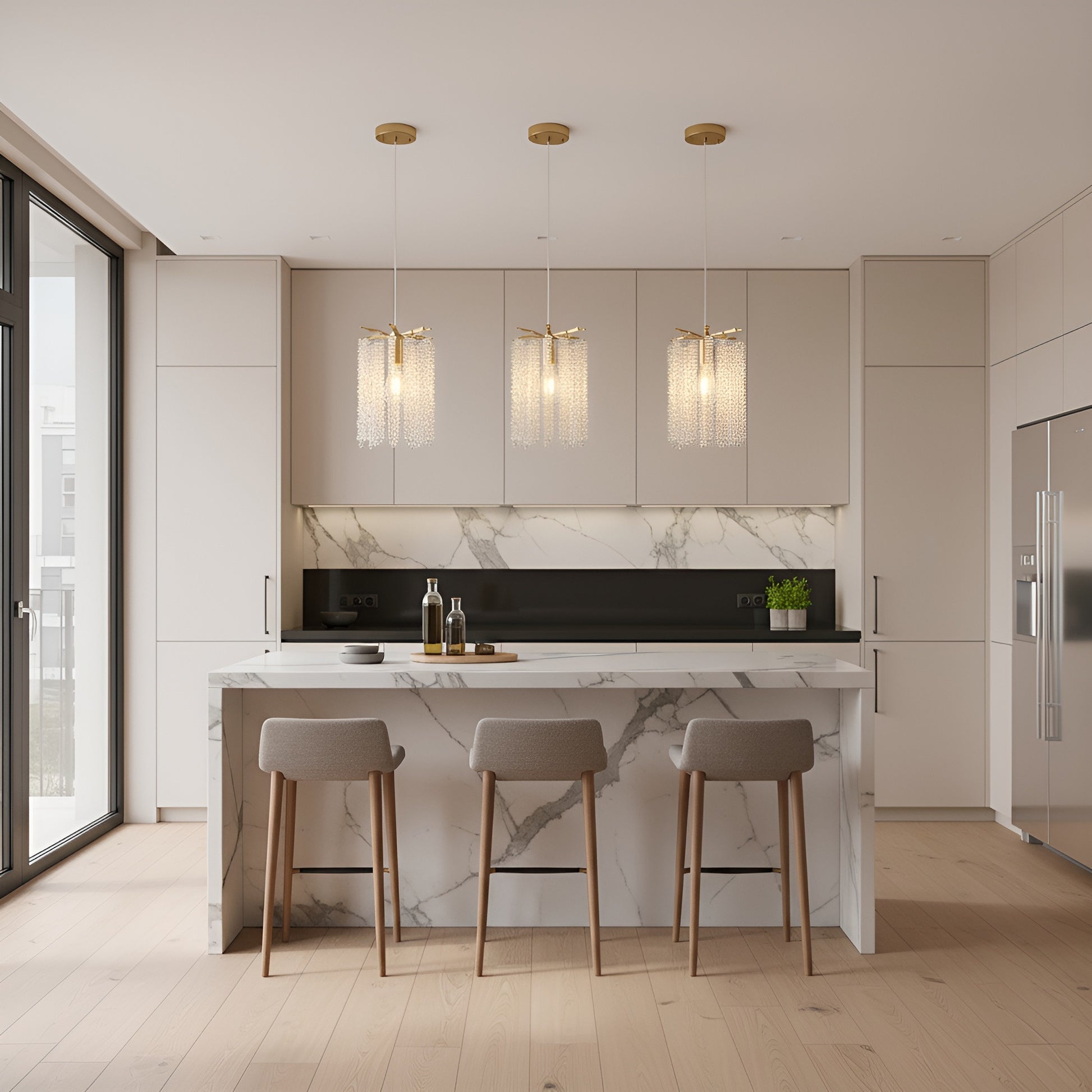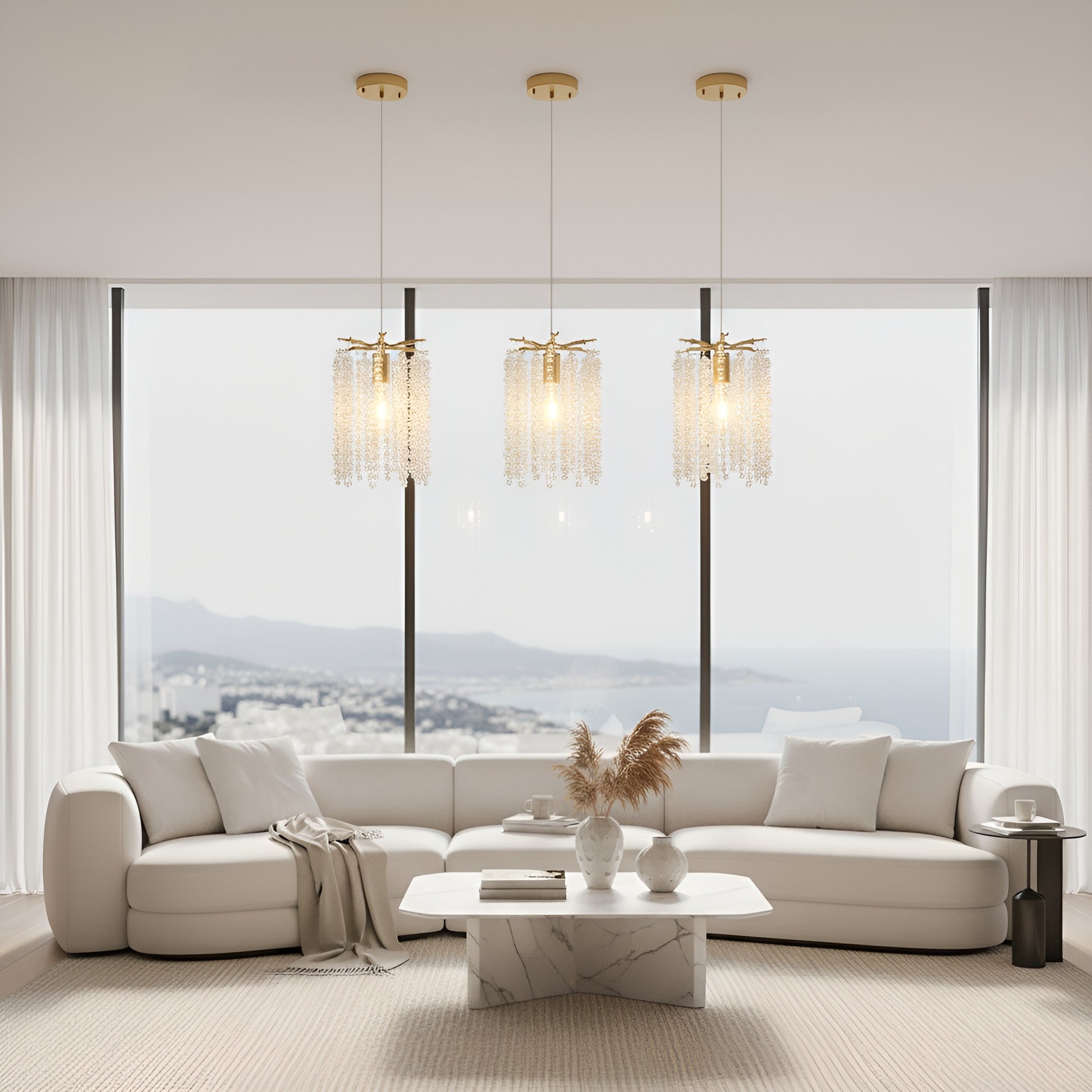 The Wisteria Bloom Pendants (3-Pack) showcase a trio of cascading glass bead lights that evoke the delicate beauty of wisteria flowers. With warm glowing bulbs and refined brass accents, they bring soft elegance and sculptural charm to dining spaces, kitchens, and modern living rooms.